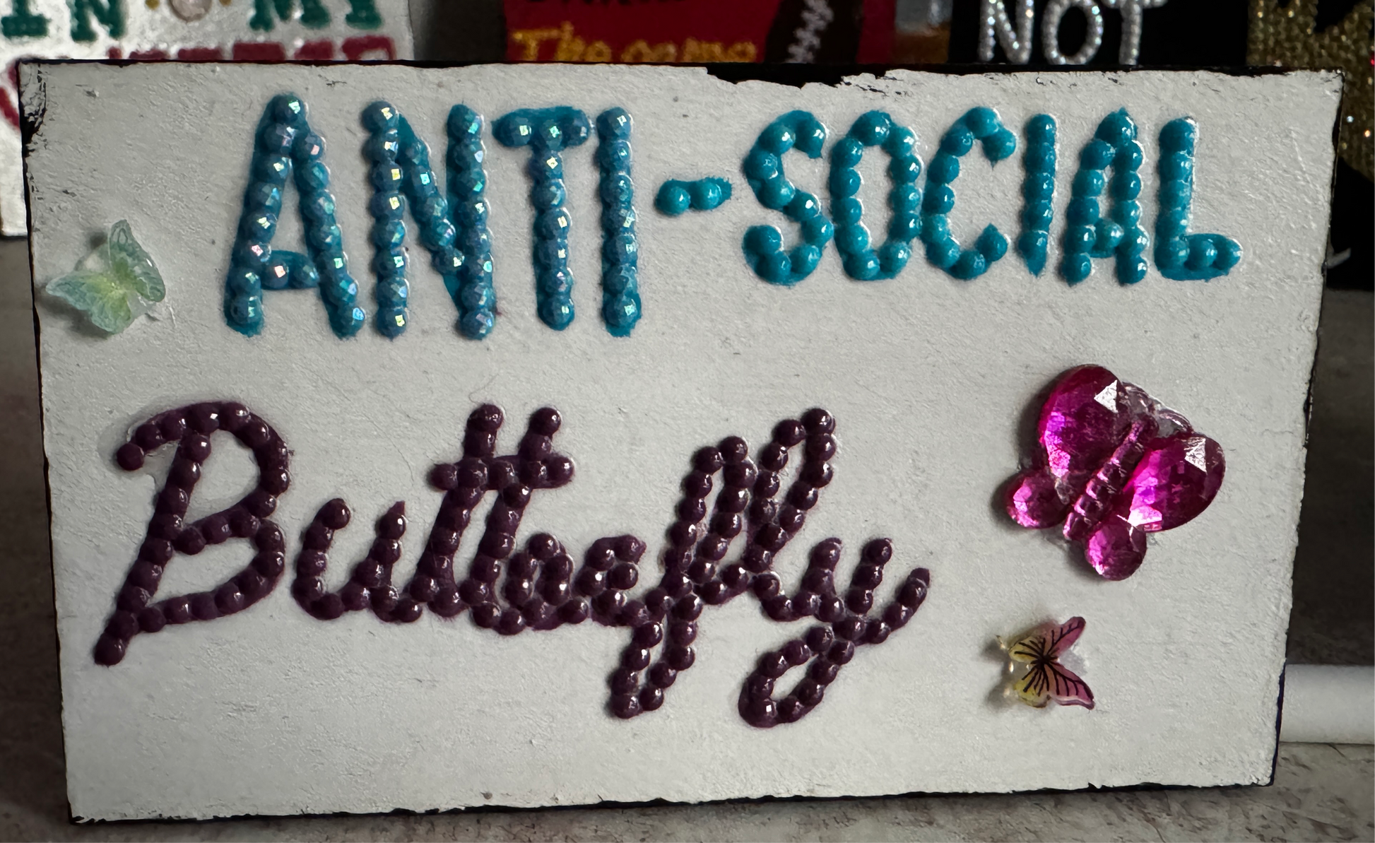 3” x 4” sign in white with jewel tone letters. Embellished with diamond dots beads and butterflies.