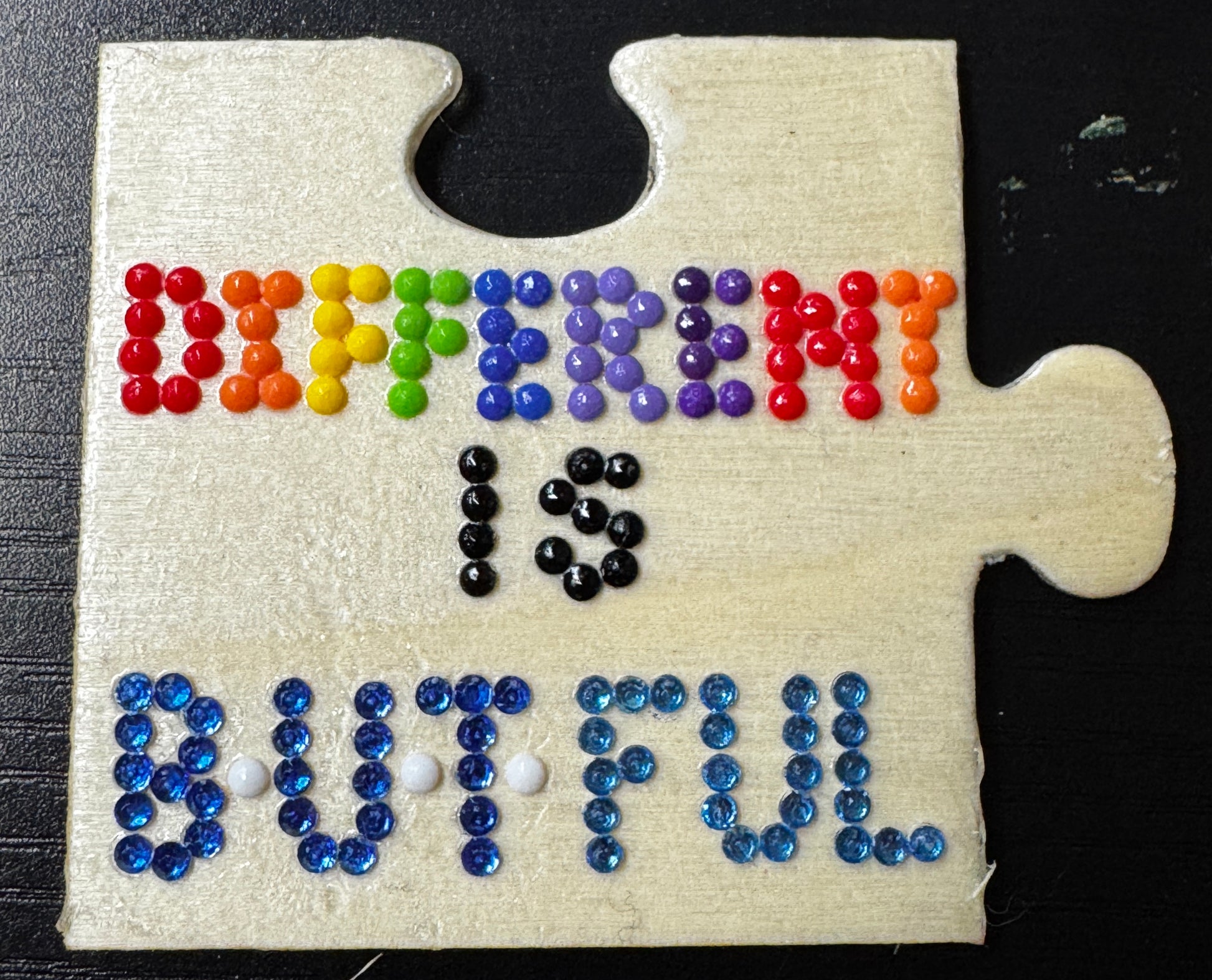 About 2" Puzzle piece for autism awareness. Rainbow colors with a quote stating "Different is B-U-T-Ful" in diamond dots beads.