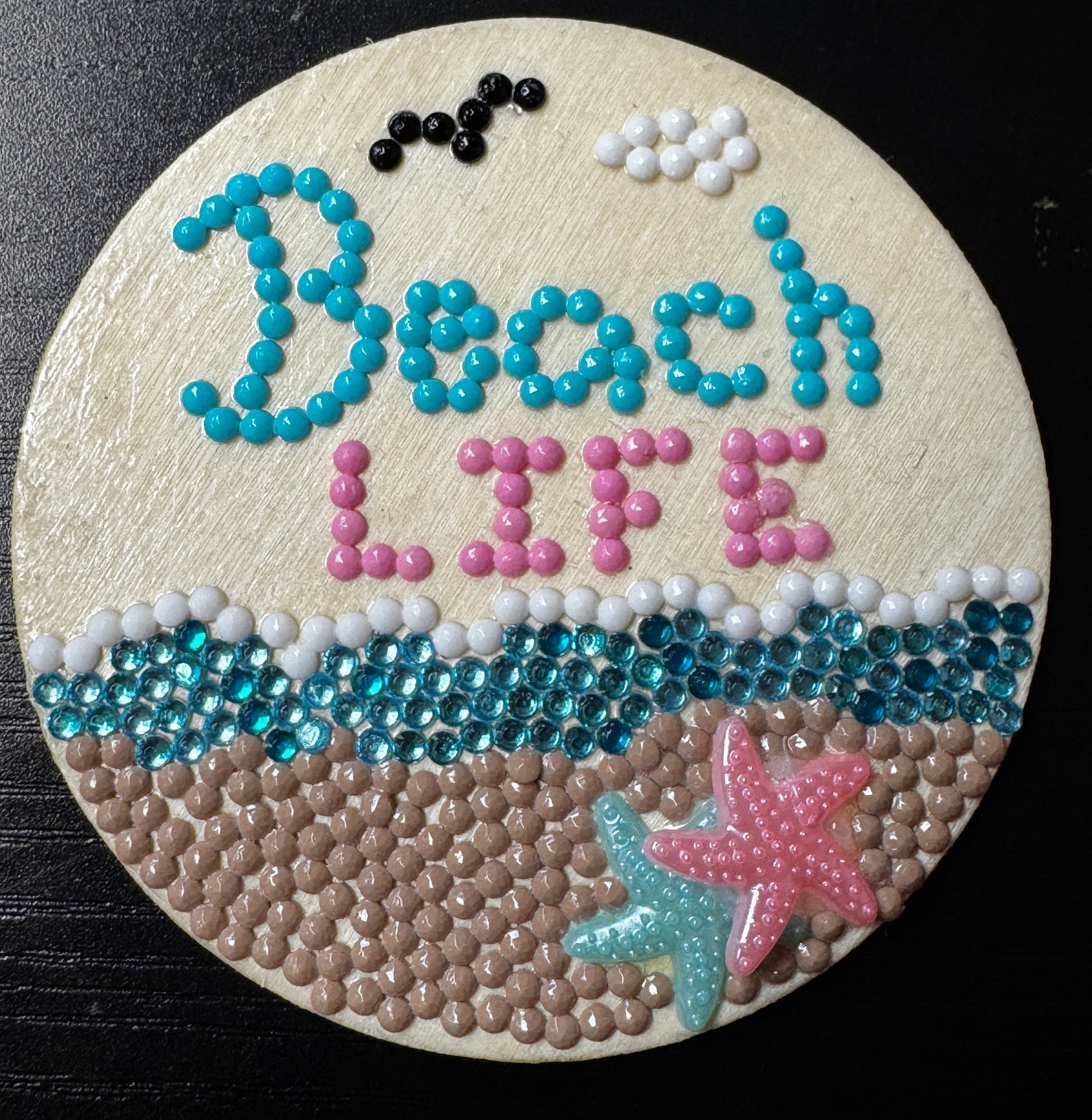 3" circle embellished with diamond dots to create a beach scene and "beach Life" quote.