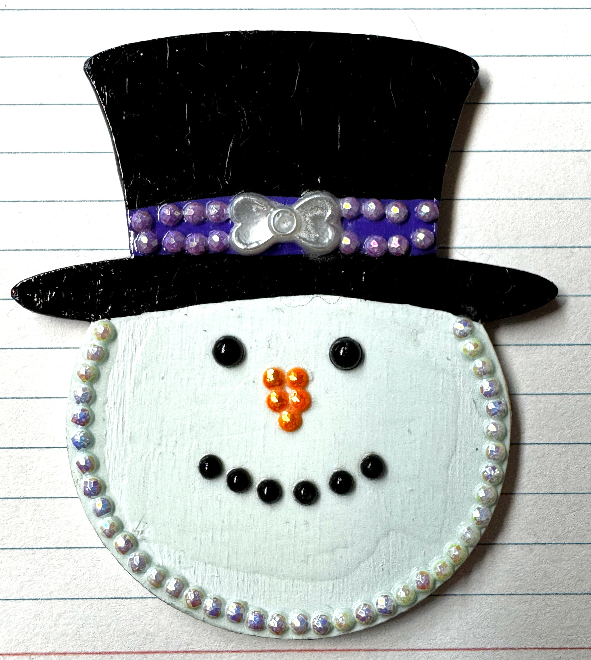 Snowman with a black top hat with a sparkly purple band and a white bow embellishment. About 3" tall.