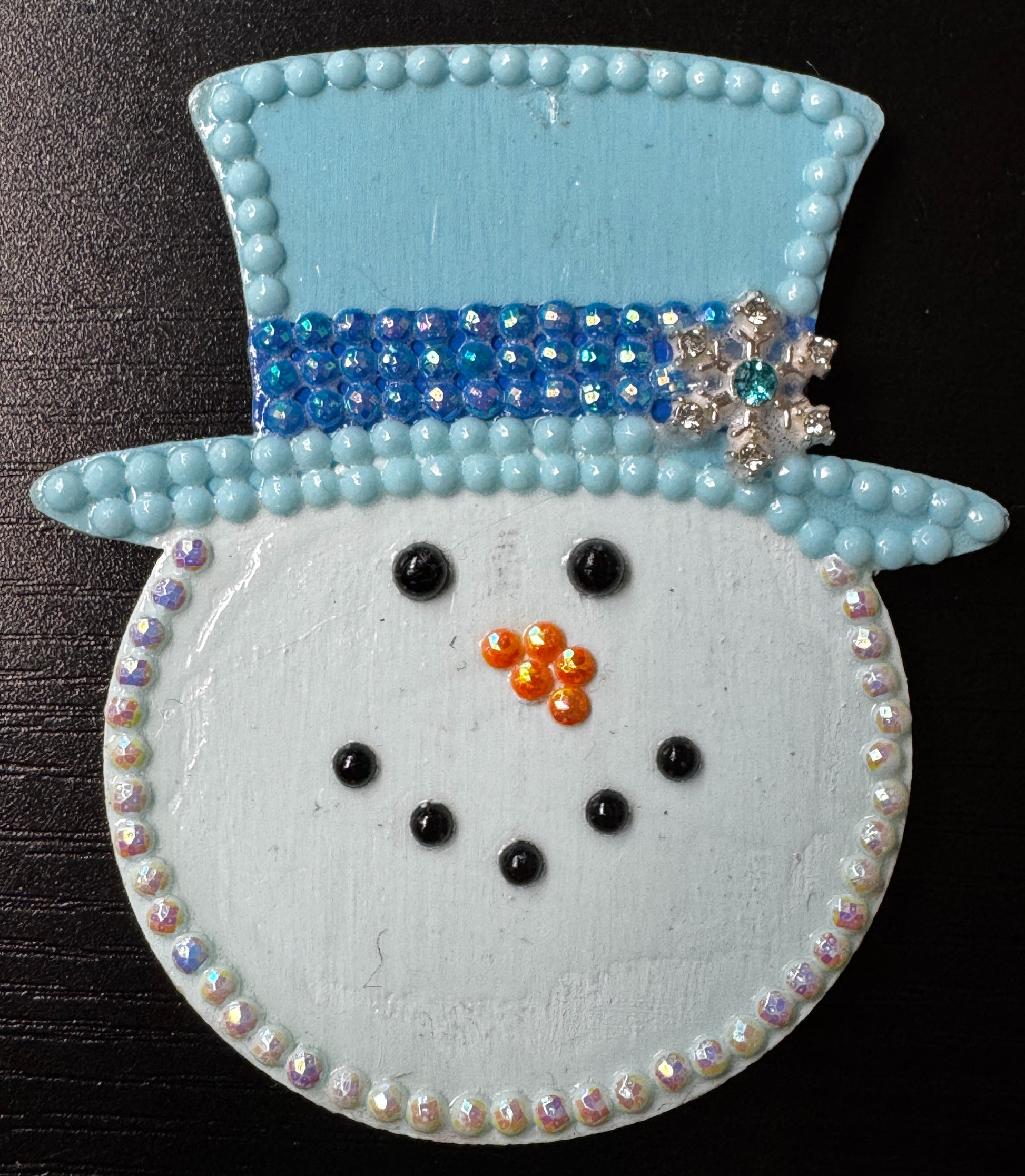 Snowman with a light blue top hat with a sparkly royal blue band and a snowflake embellishment. About 3" tall.
