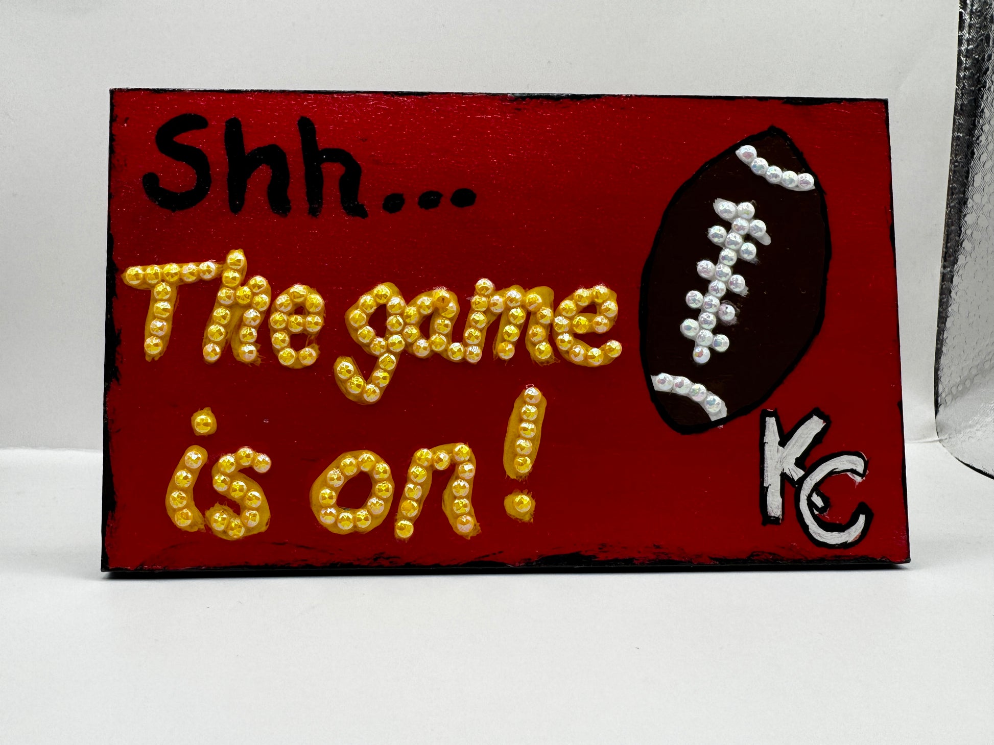 3” x 4” sign in Chiefs colors with a football and embellished with diamond dots beads.