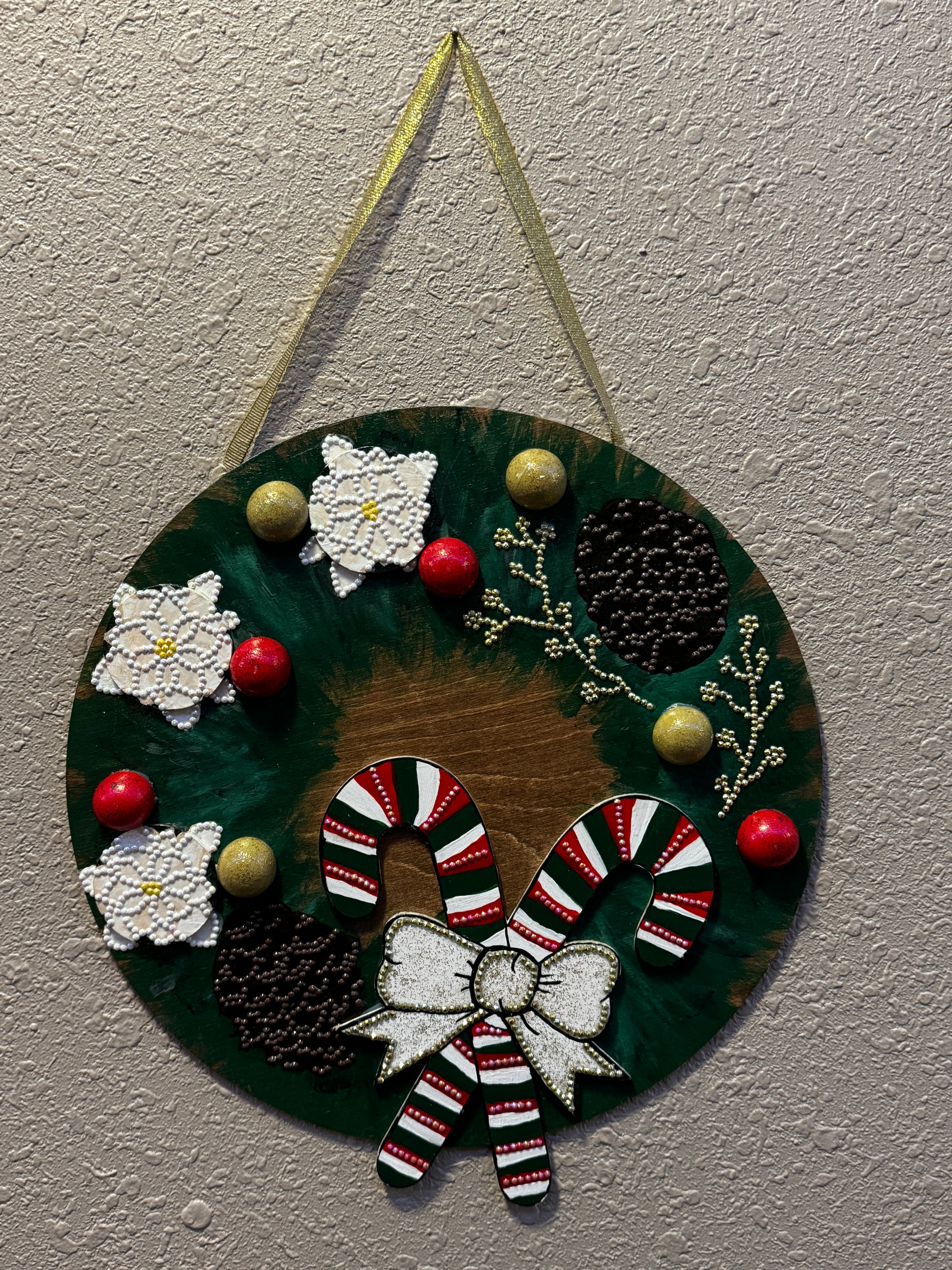 12" circle painted green with painted pine cones and poinsettias. Wreath includes many 3D embellishments including ornaments and a candy cane duo with bow.