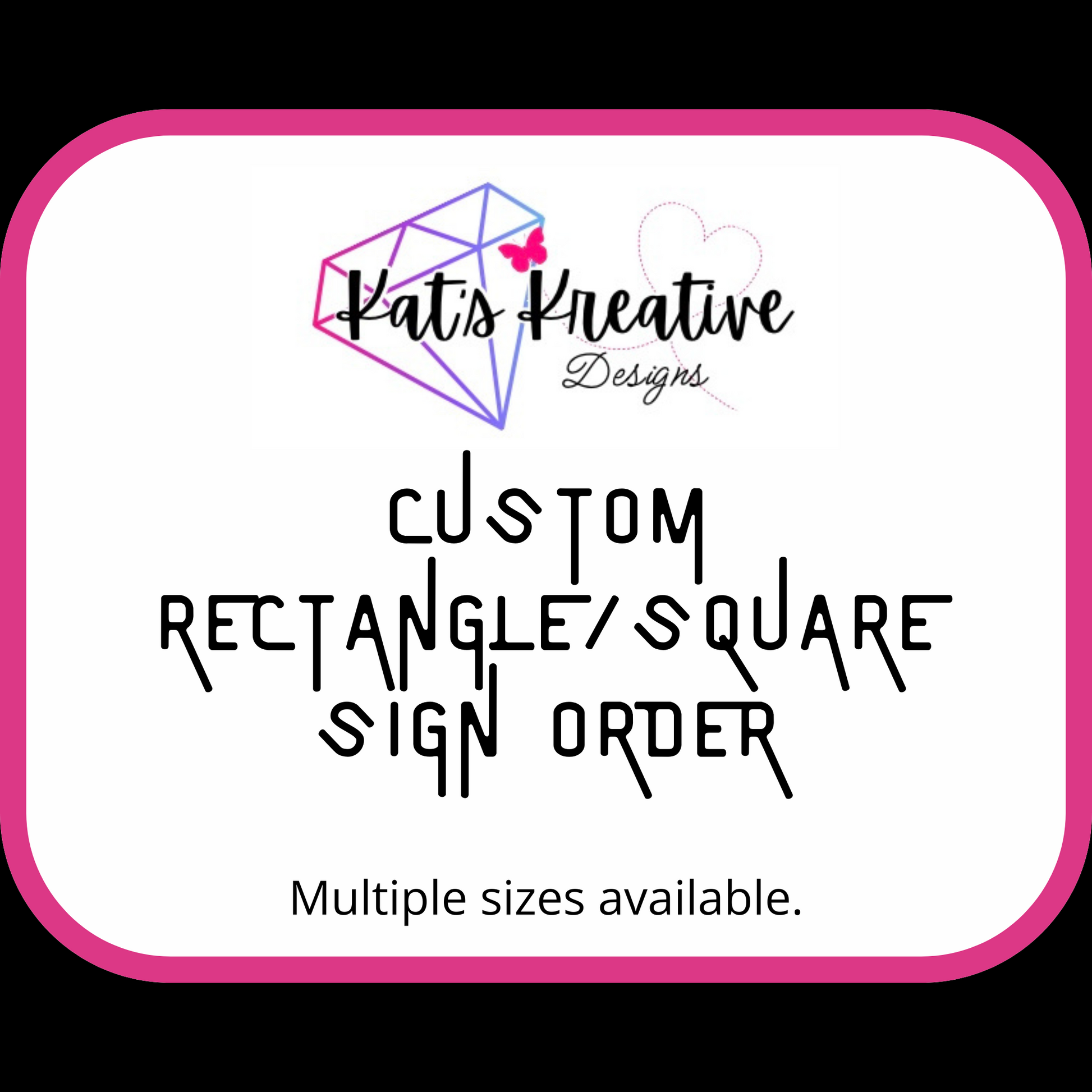 Custom created rectangle or square signs. Signs can have hanging ribbons, a stand for sitting on a table/shelf, or nothing where you can sit it on an easel.