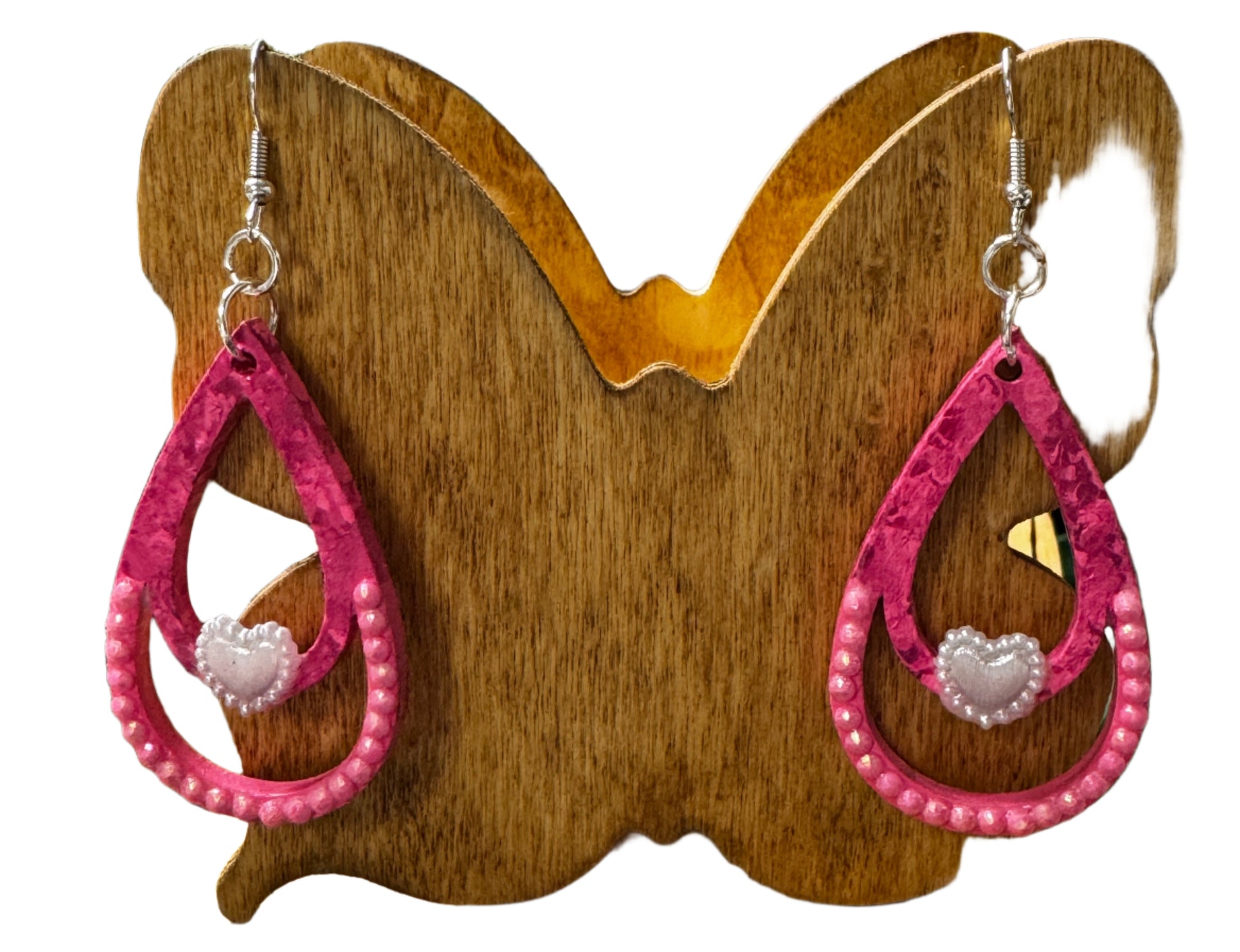 2" double teardrop earrings painted bright pink with a darker pink "tie dye" top. Embellished with diamond dots beads and a white heart.