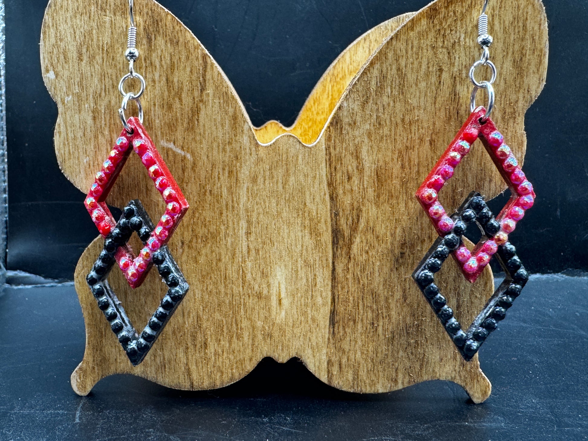 2” double diamond wooden earrings painted red and black and embellished with diamond dots beads.