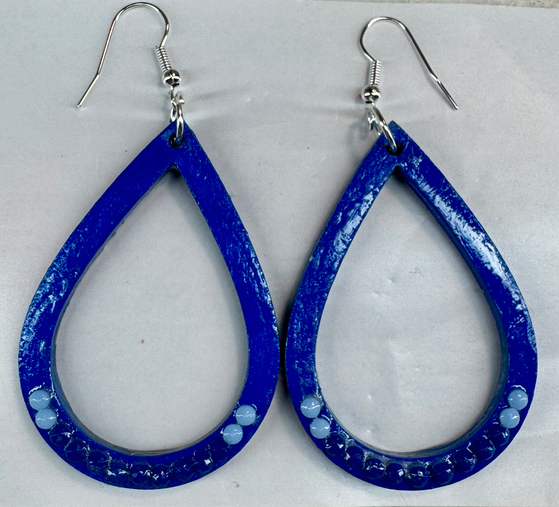 2" teardrop earrings painted royal blue. Embellished with diamond dots beads.