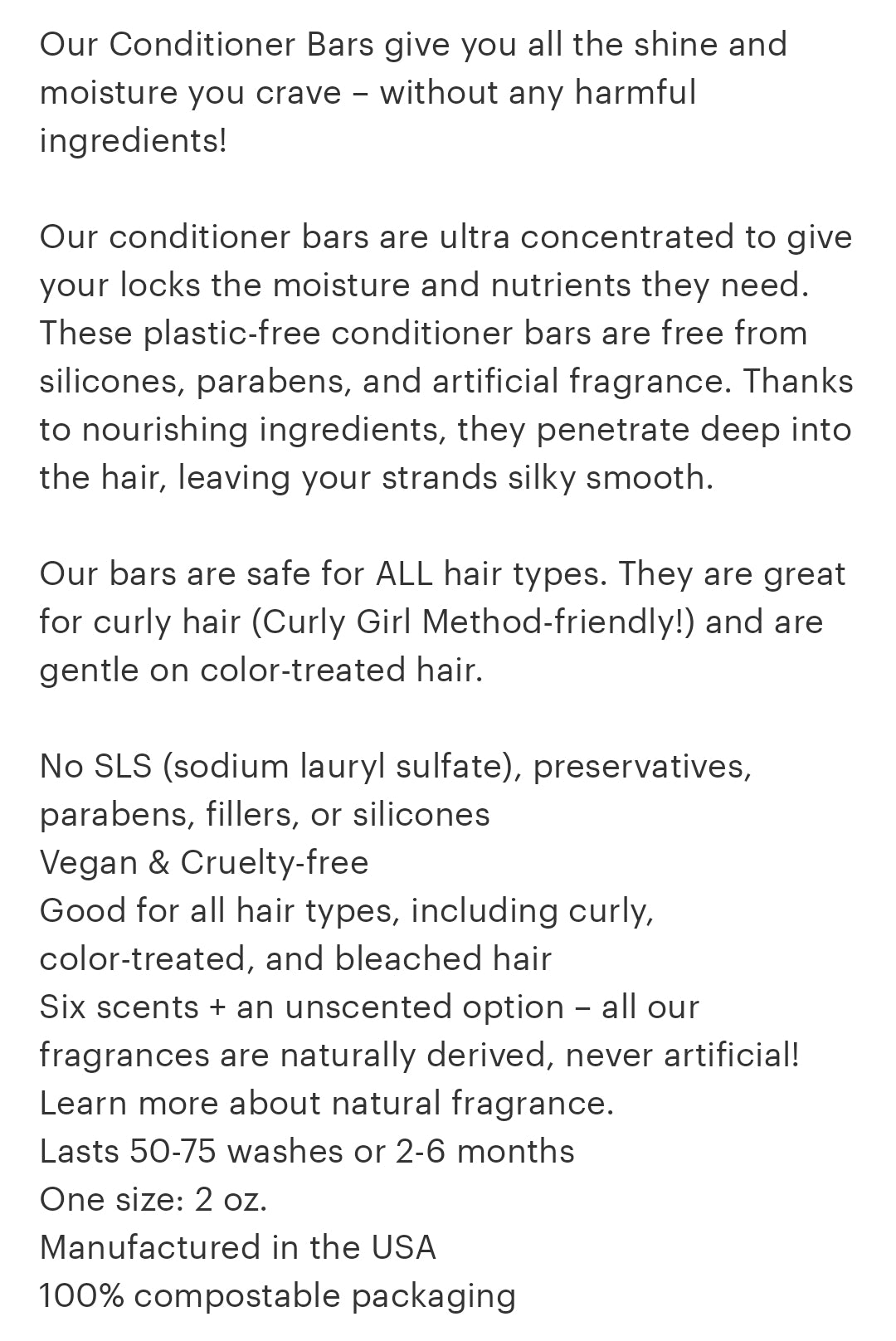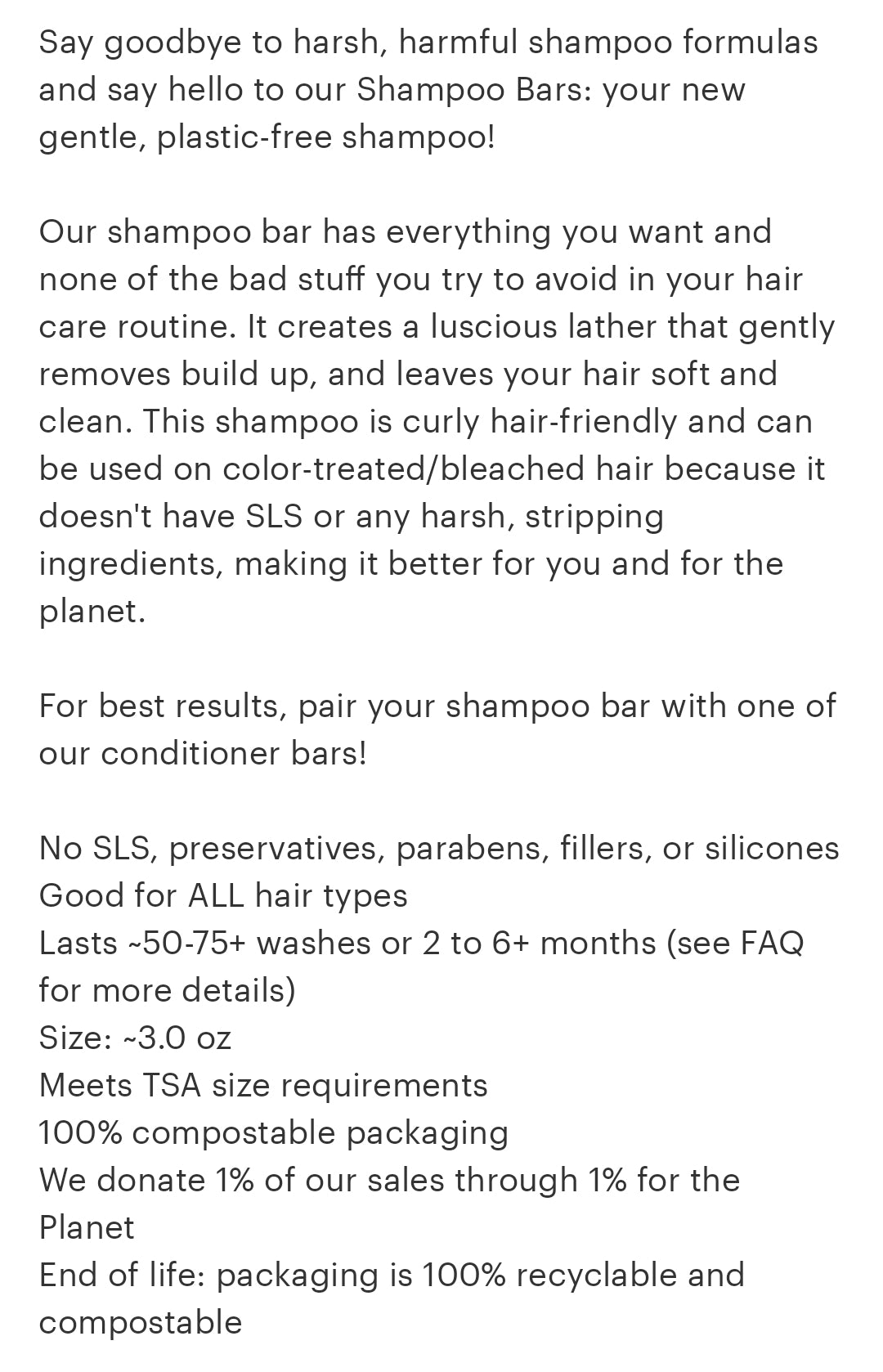 Our shampoo bar has everything you want and none of the bad stuff you try to avoid in your hair care routine. It creates a luscious lather that gently removes build up, and leaves your hair soft and clean. This shampoo is curly hair-friendly and can be used on color-treated/bleached hair because it doesn't have SLS or any harsh, stripping ingredients, making it better for you and for the planet.