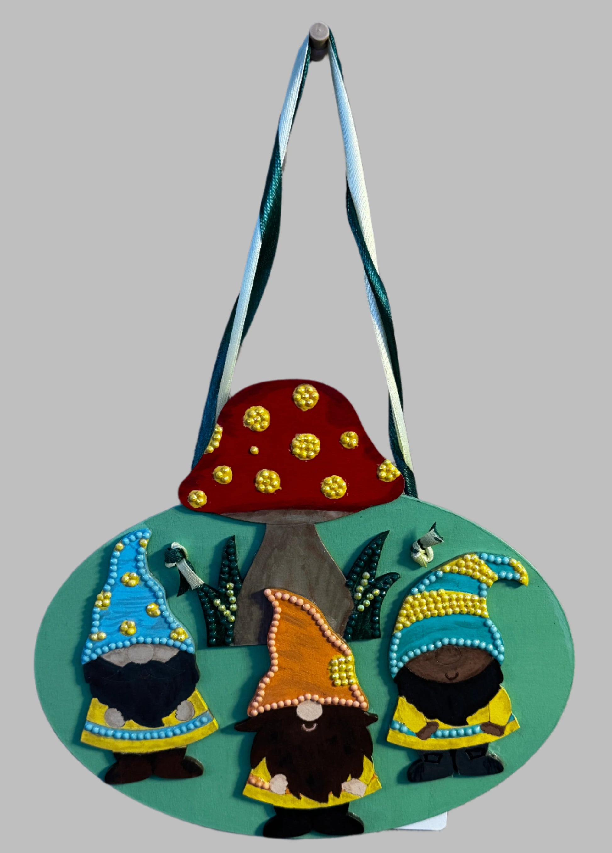 Painted oval sign about 7" wide decorated with 3 hand painted gnomes of diverse ethnicity surrounding a mushroom. Embellished diamond dots beads.