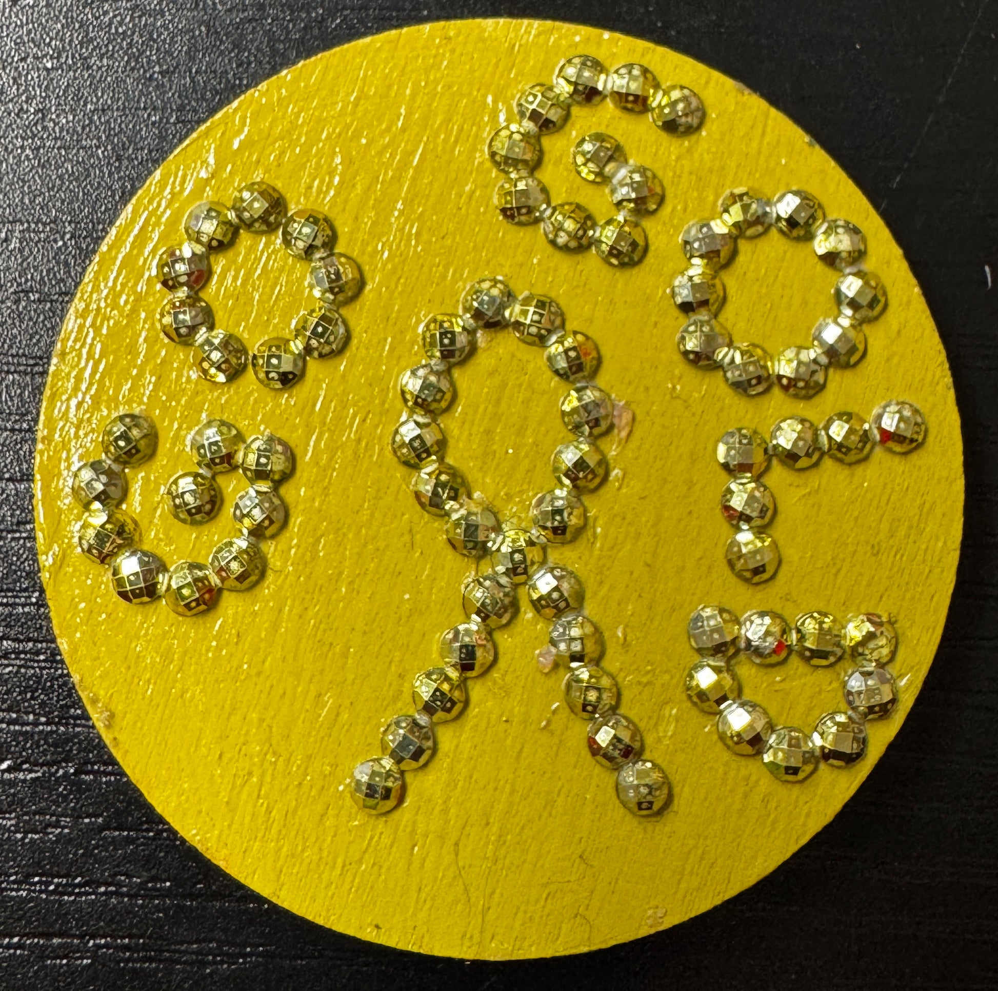 1 1/2" circle painted gold and embellished with gold diamond dots beads creating a gold ribbon and a "Go gold" quote. In honor of Childhood Cancer Awareness (recognized in September) in honor of my son Cody McCoy.