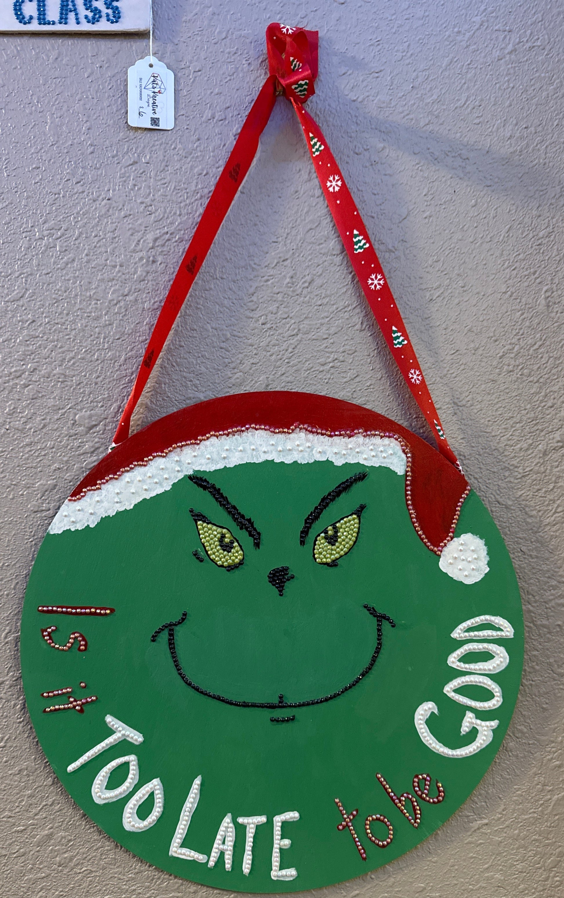 12" circle painted green with a Grinch sneer. Quote added with diamond dots beads "Is it too late to be good?"