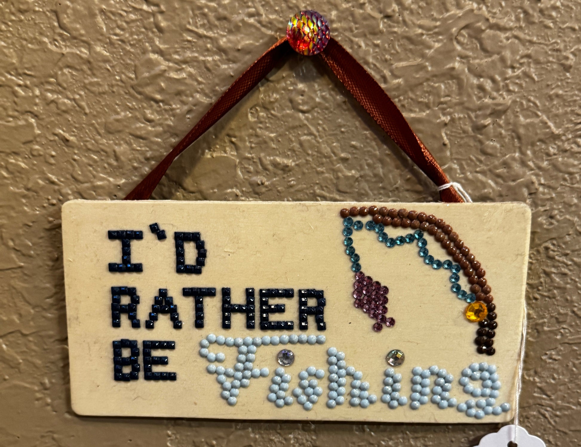 2" x 5" hanging sign embellished with a fishing pole and "I'd rather be fishing" quote using diamond dots beads.