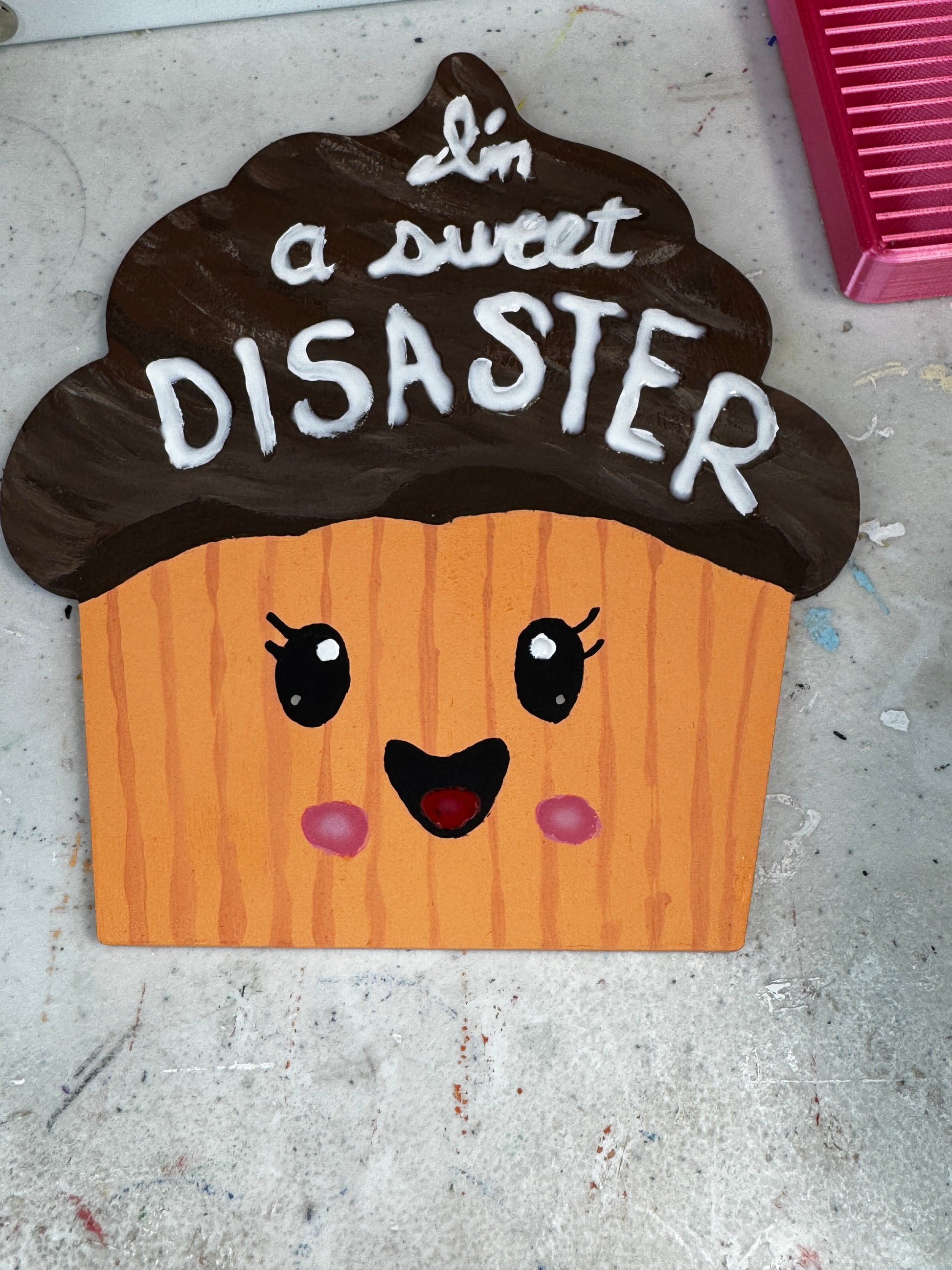 6" cupcake shaped sign with "I'm a Sweet Disaster" quote created with a little off-kilter embellishments and a cartoon type face with eyelashes.