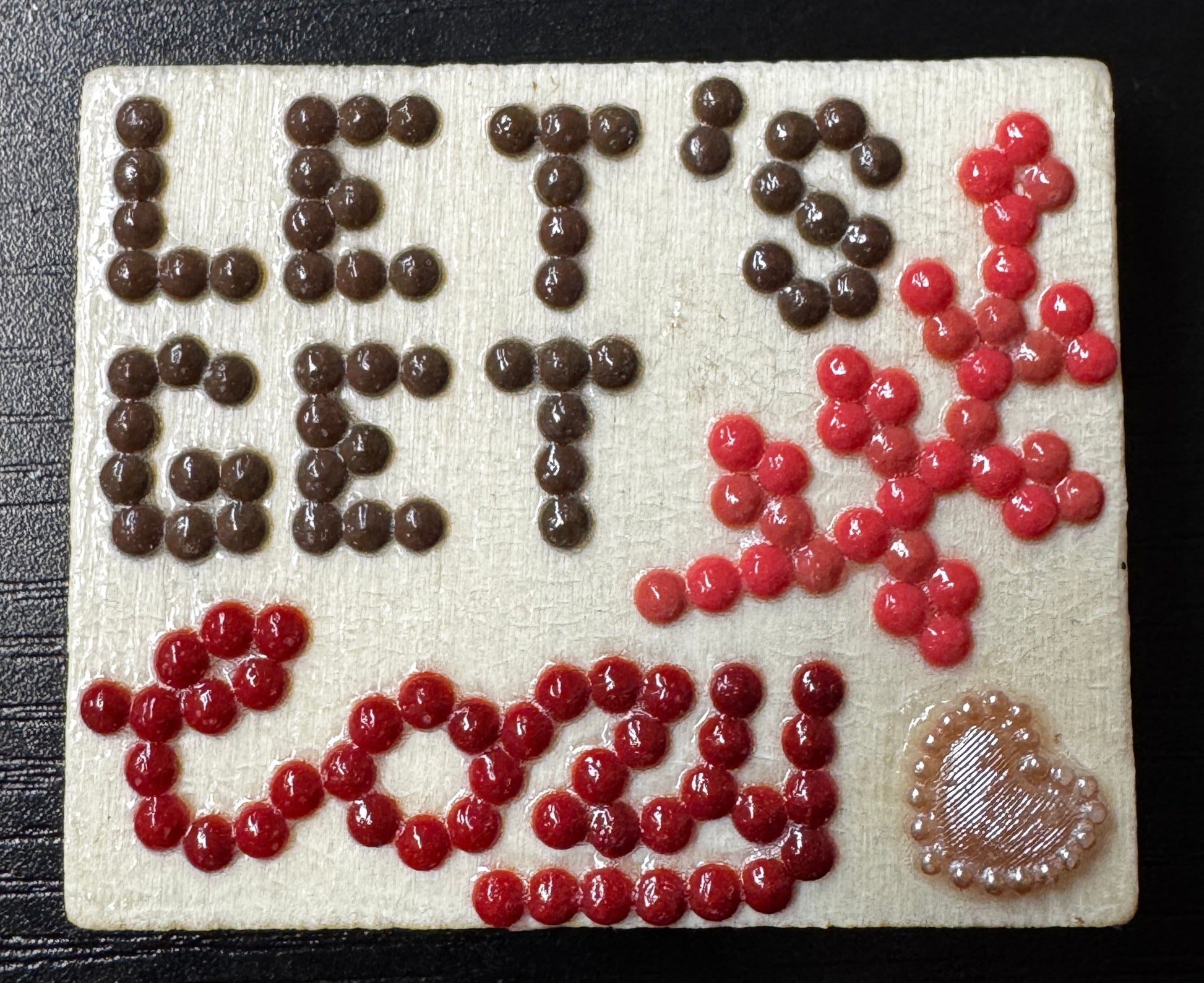 1 1/2" x 2" rectangle embellished with diamond dots beads spelling "Let's Get Cozy"