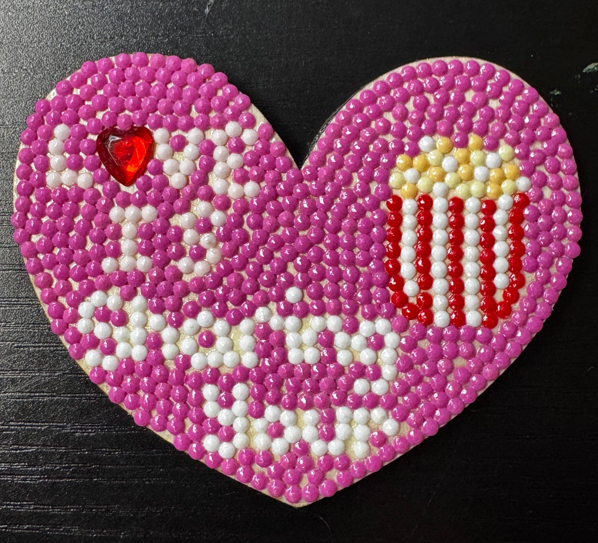 3" heart shaped magnet embellished with diamond dots beads to create "Life is Sharing your" and a popcorn bucket.