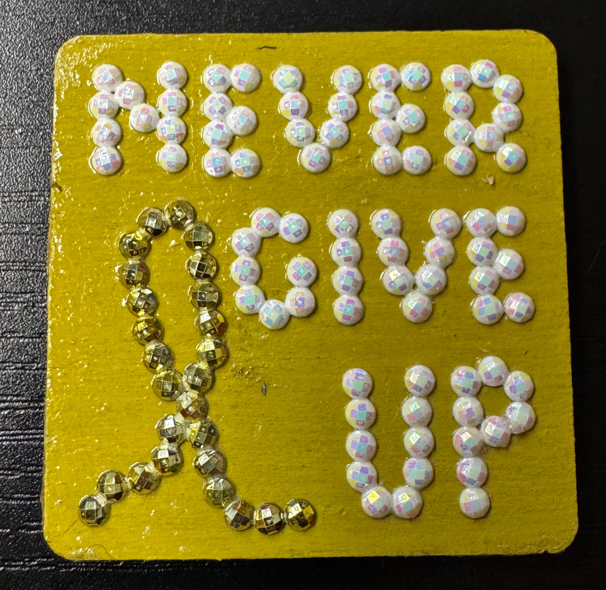 1 1/2" square painted gold and embellished with gold diamond dots beads creating a gold ribbon and a "Never Give Up" quote. In honor of Childhood Cancer Awareness (recognized in September) in honor of my son Cody McCoy.