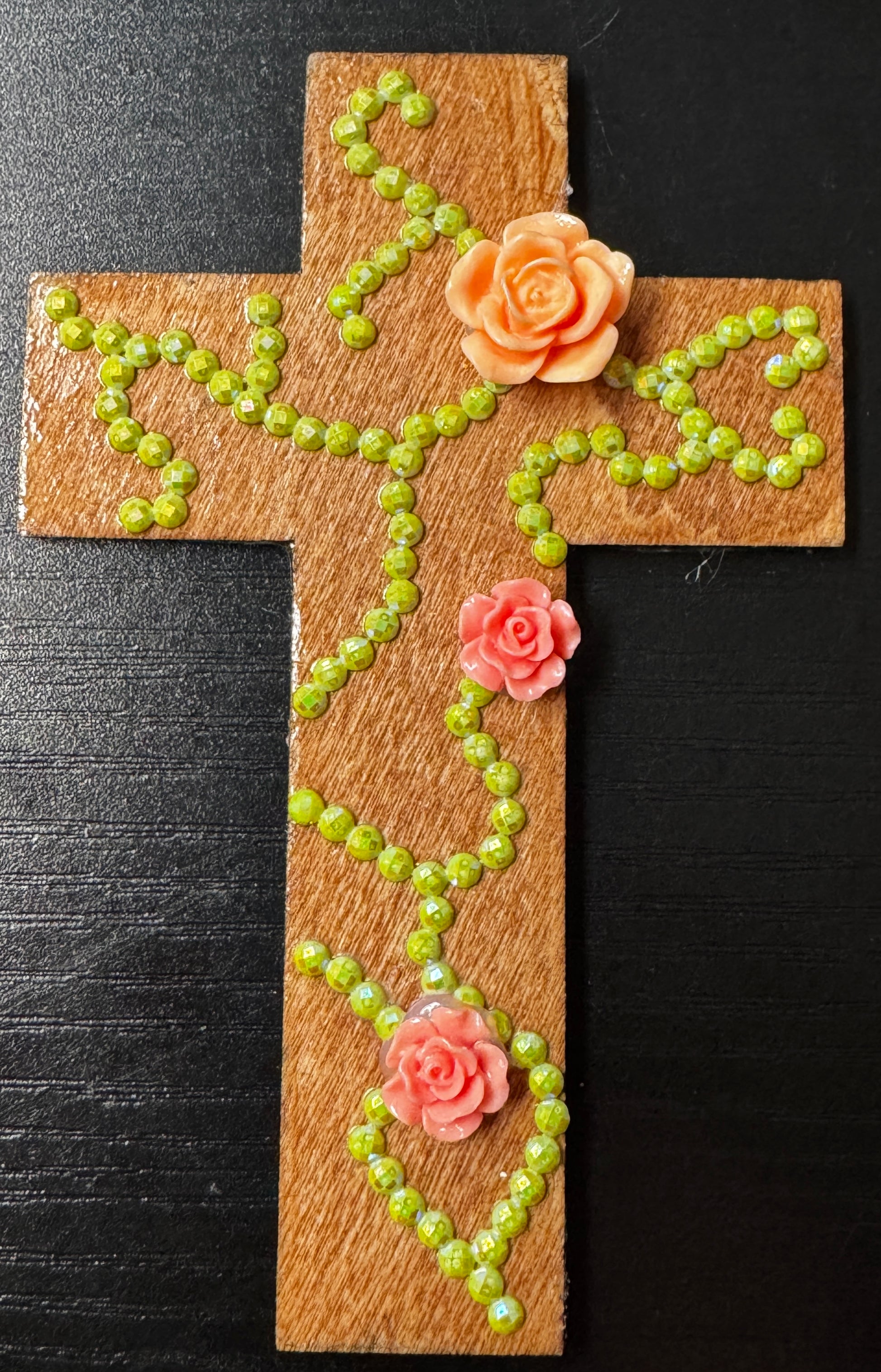 Wood stained 4" cross embellished with 3D peach roses and green vines created by diamond dots beads.