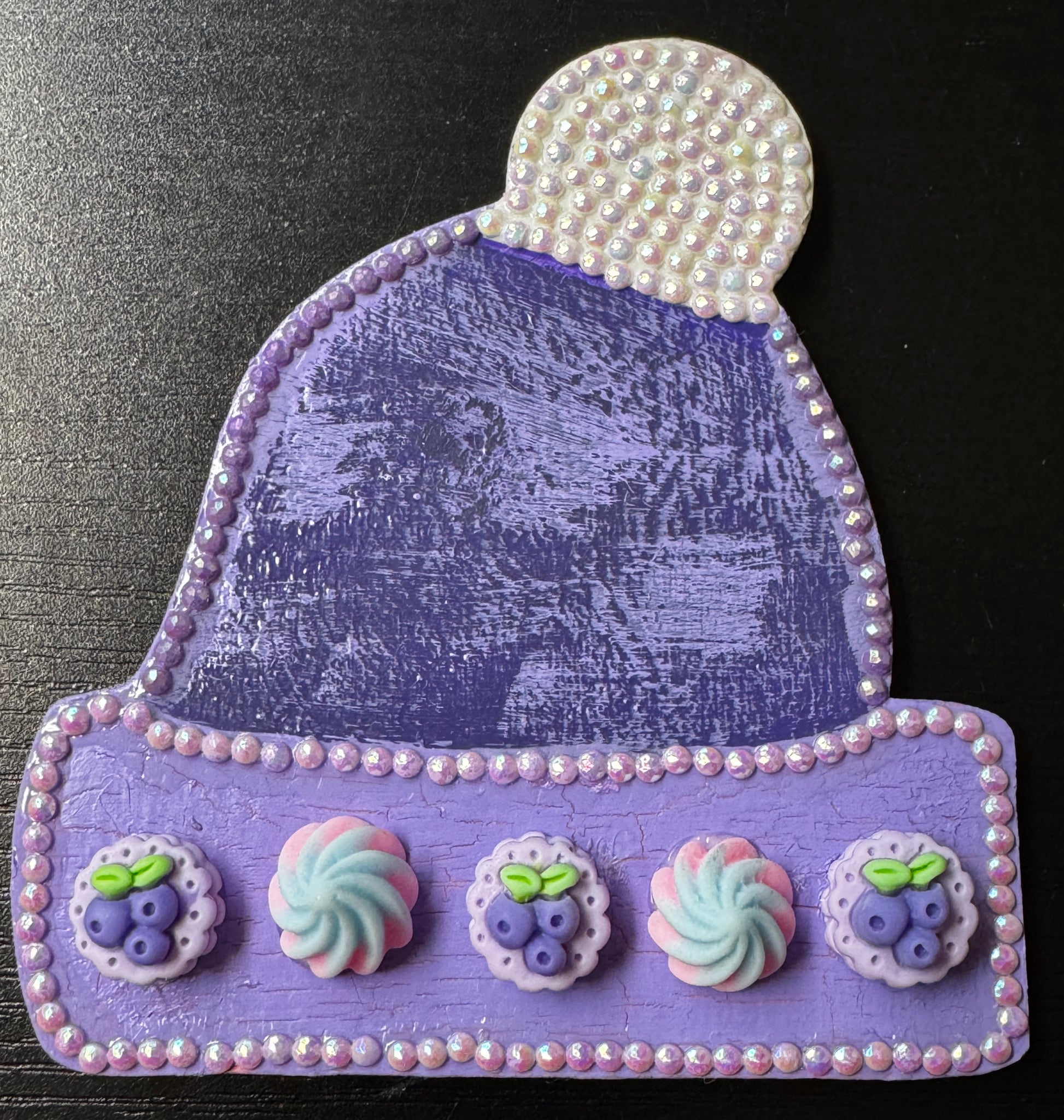 Lavender and purple stocking cap shaped magnet with a white sparkly pom pom top. Embellished with small candy pieces. About 4" tall.
