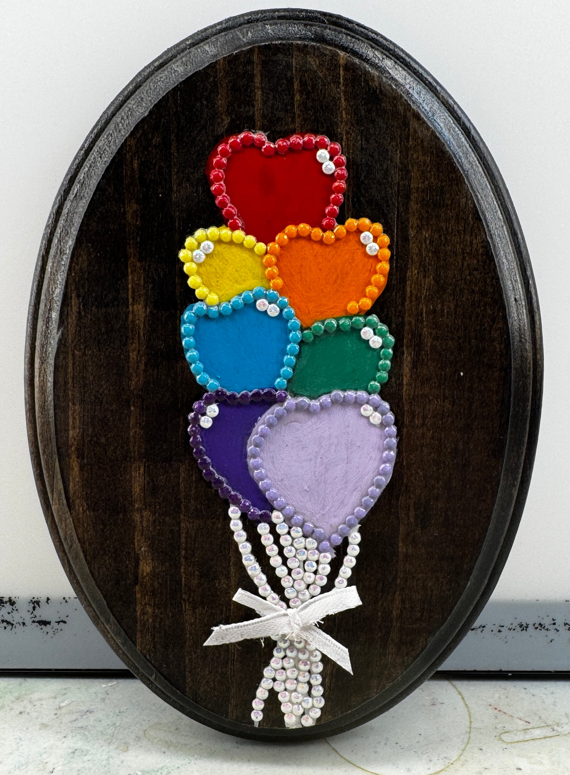 Celebrate love, joy, and unity with this stunning handcrafted wooden wall art featuring a bouquet of rainbow heart balloons against a rich dark wood background. Each heart is hand-painted in vibrant colors and adorned with sparkling bead accents to add texture and shine. A delicate white ribbon bow ties the bouquet together, completing this charming design.