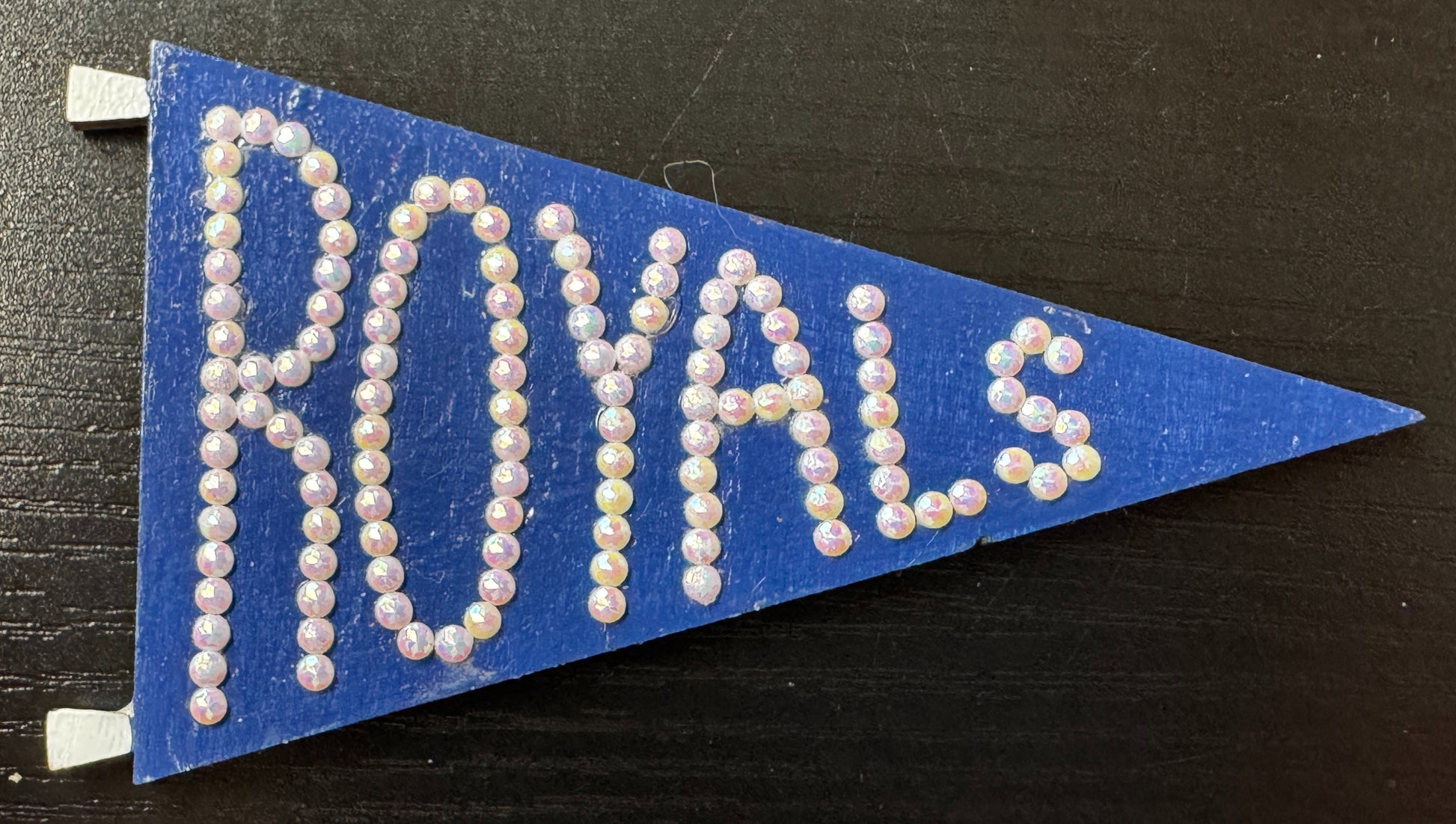 About 4" dark blue pennant flag with Royals spelled out in sparkly diamond dot embellishments.