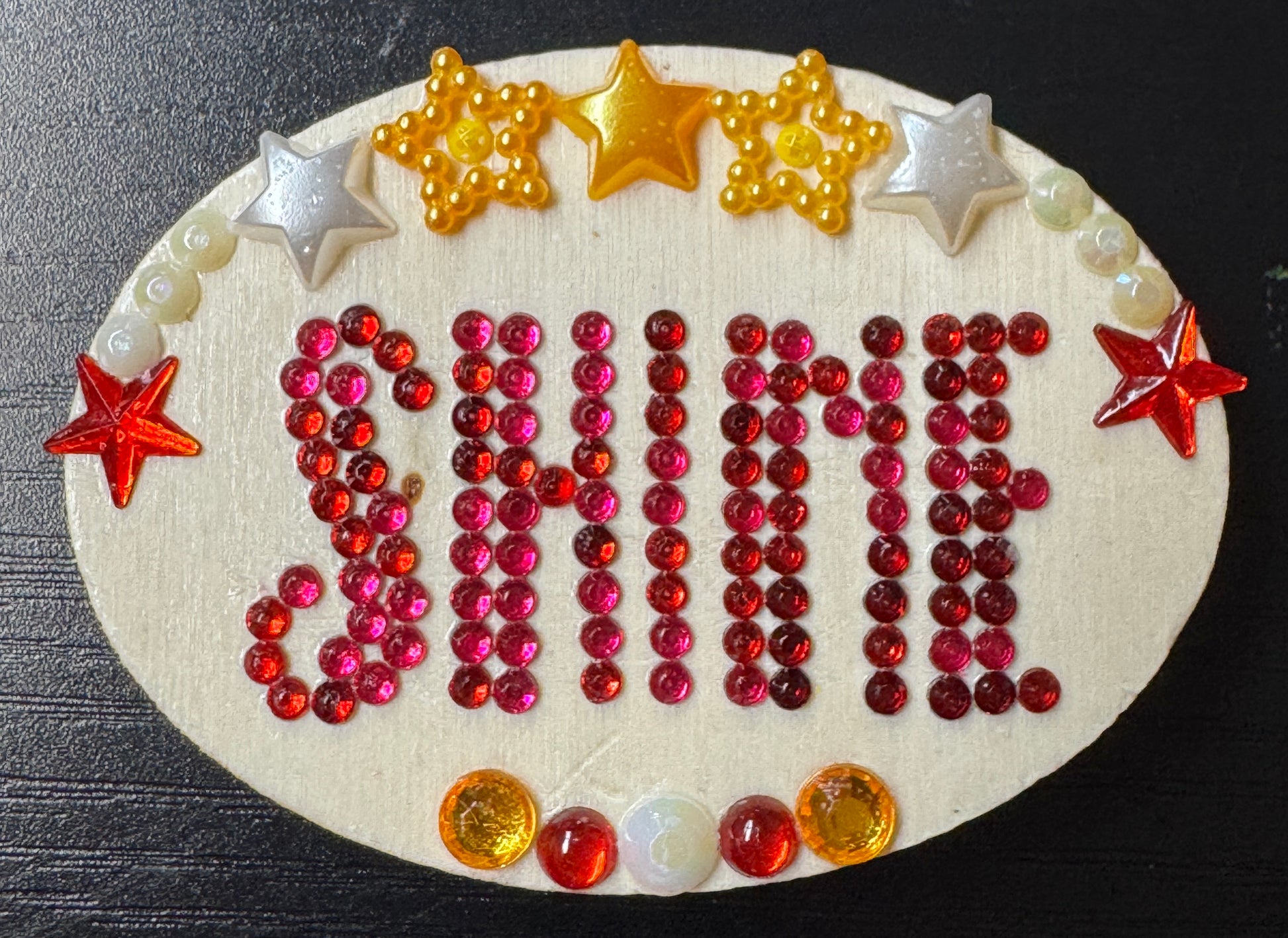 3" oval embellished with diamond dots beads spelling "SHINE" and additional gems.