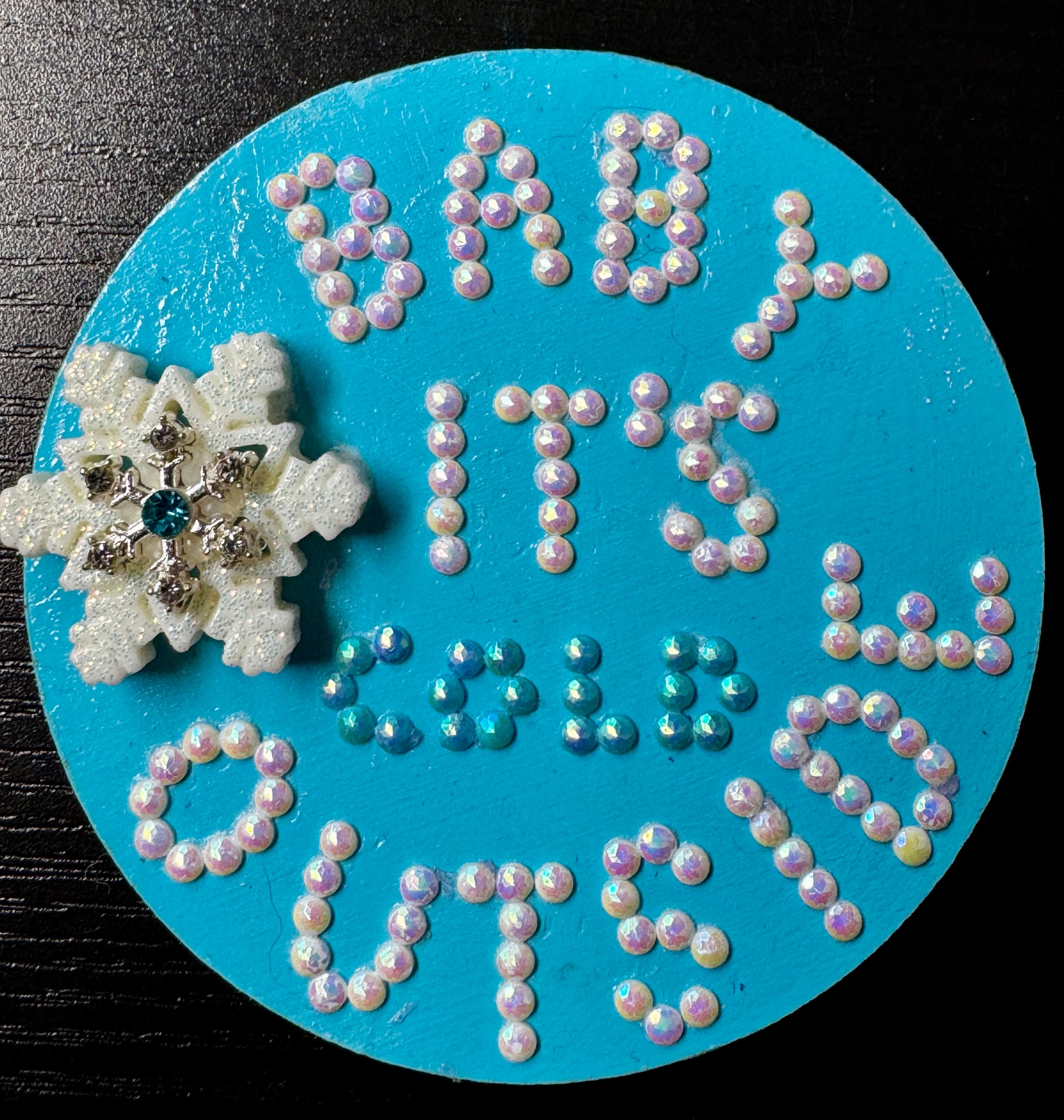 Light blue 3" circle with snowflake embellishment and "Baby it's cold outside" quote in sparkly diamond dot beads.