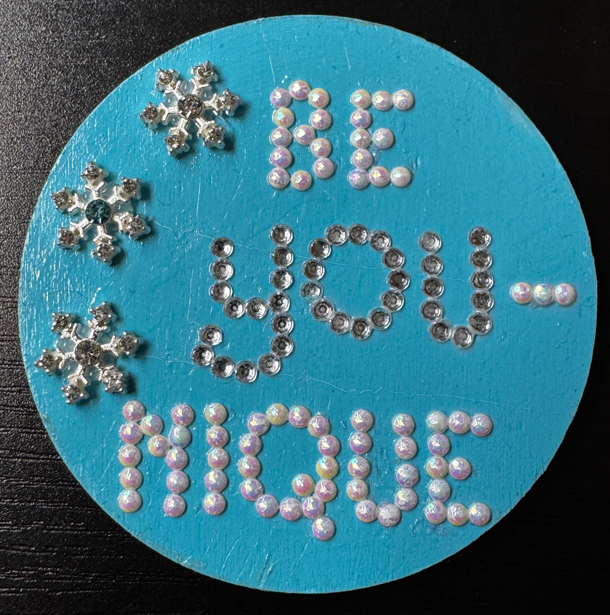 Light blue 2" circle with snowflake embellishment and "Be You-Nique" quote in sparkly diamond dot beads.