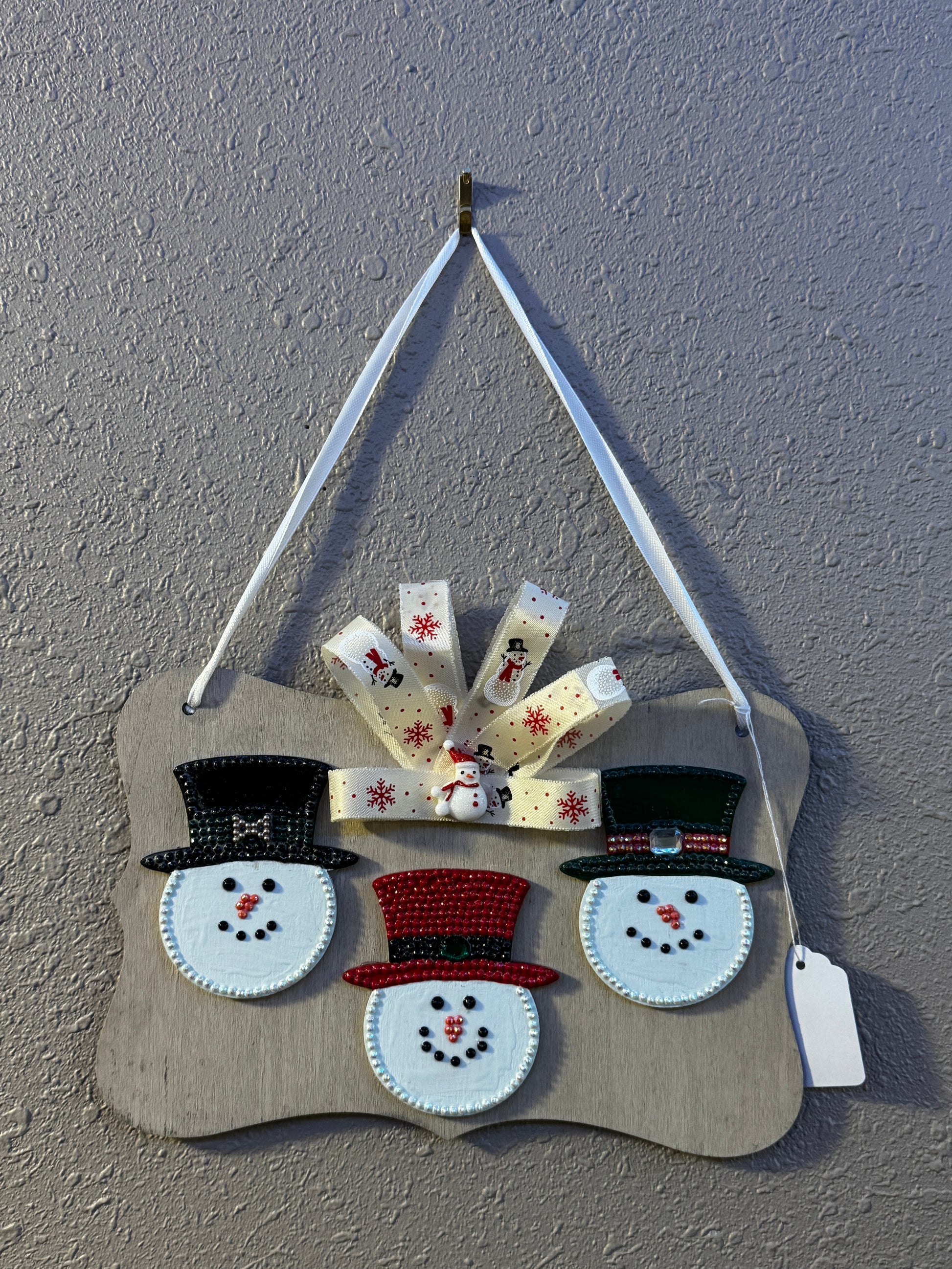6" Inch sign with 3 different snowman heads and a ribbon embellishment.