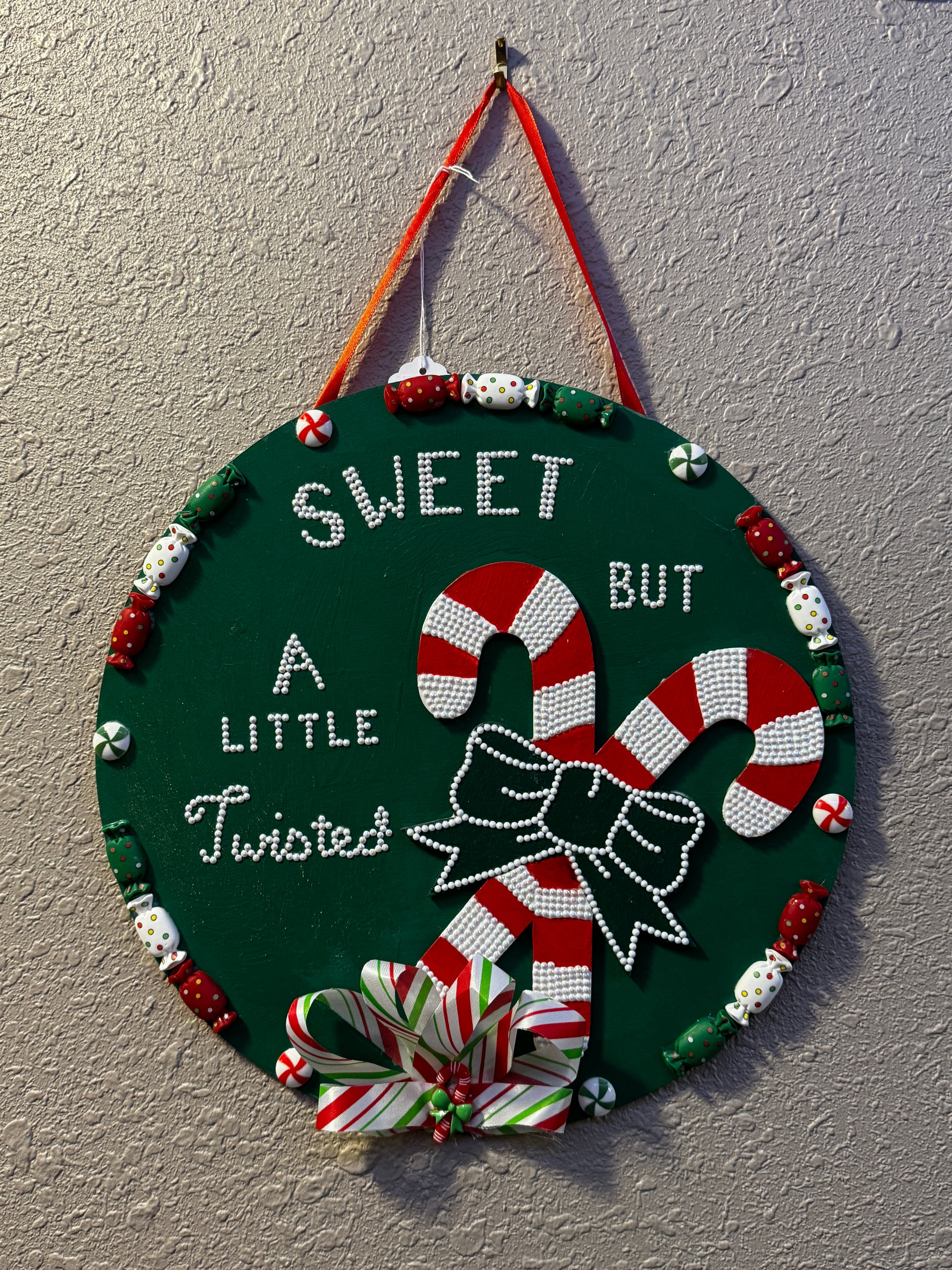 12" circle painted green. Includes 3D candy Cane, candy, and a ribbon embellishment. Quote created with sparkly diamond dots beads.