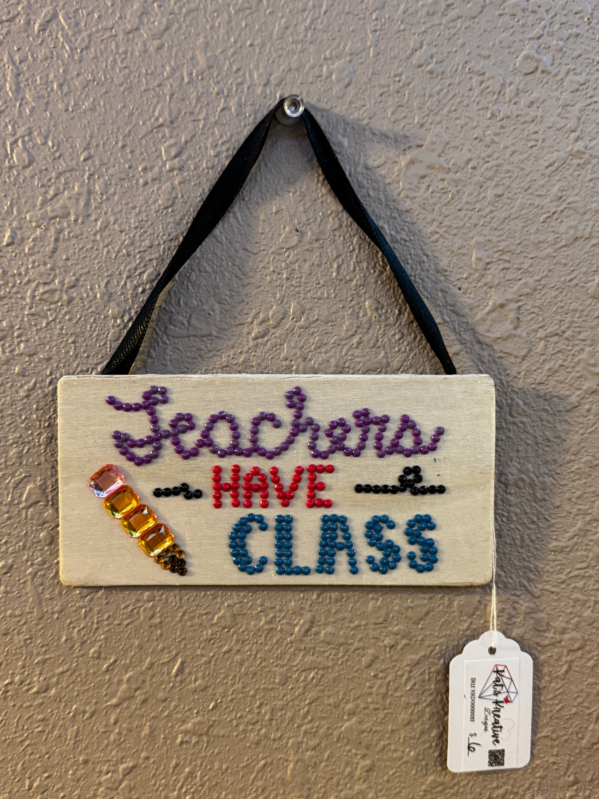 2" x 5" hanging sign embellished with a pencil created with gems and the "Teachers Have Class" Quote created with diamond dots beads.