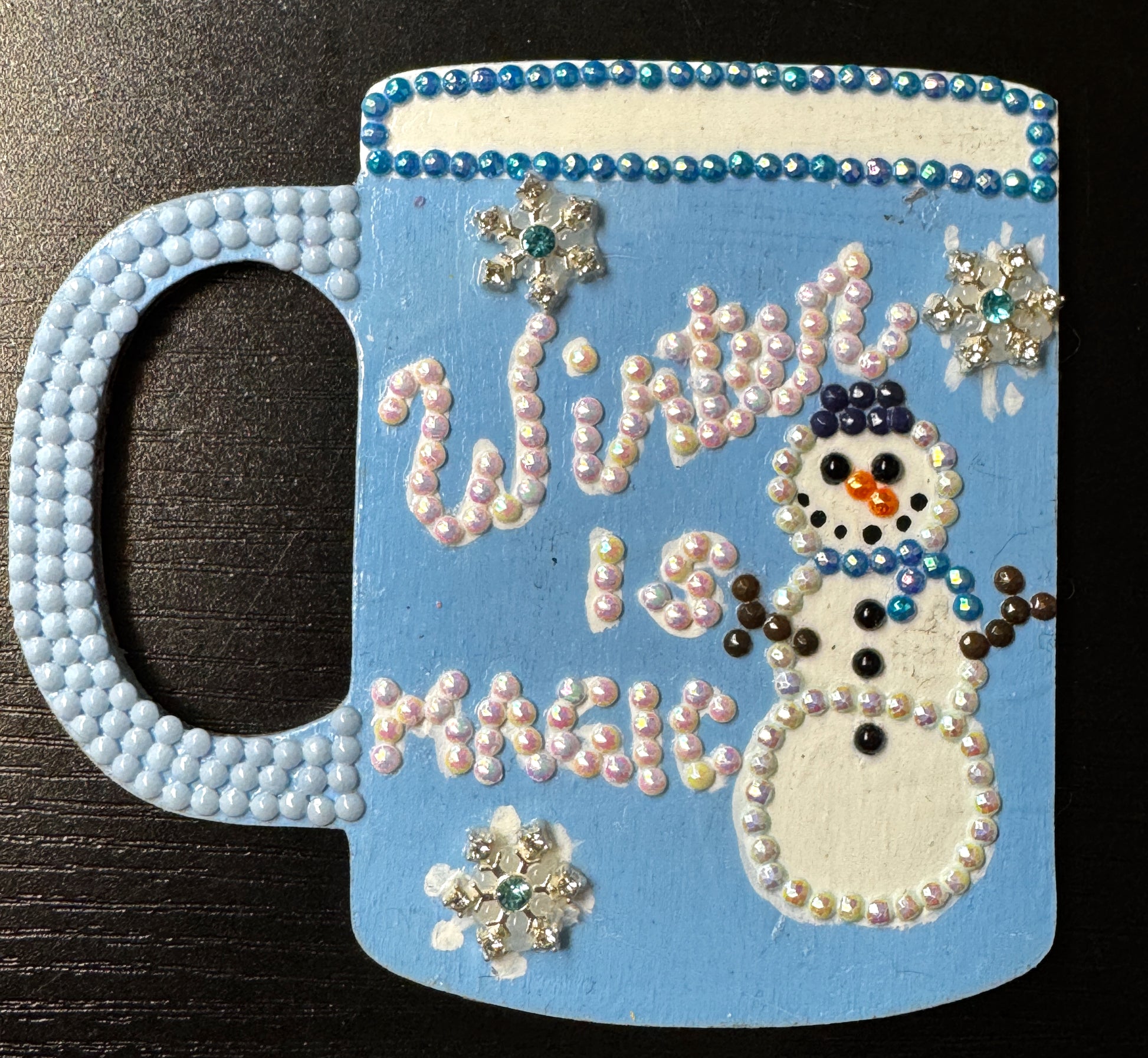 Light blue mug shaped magnet with snowflake and snowman embellishments with "Winter is Magic" quote.